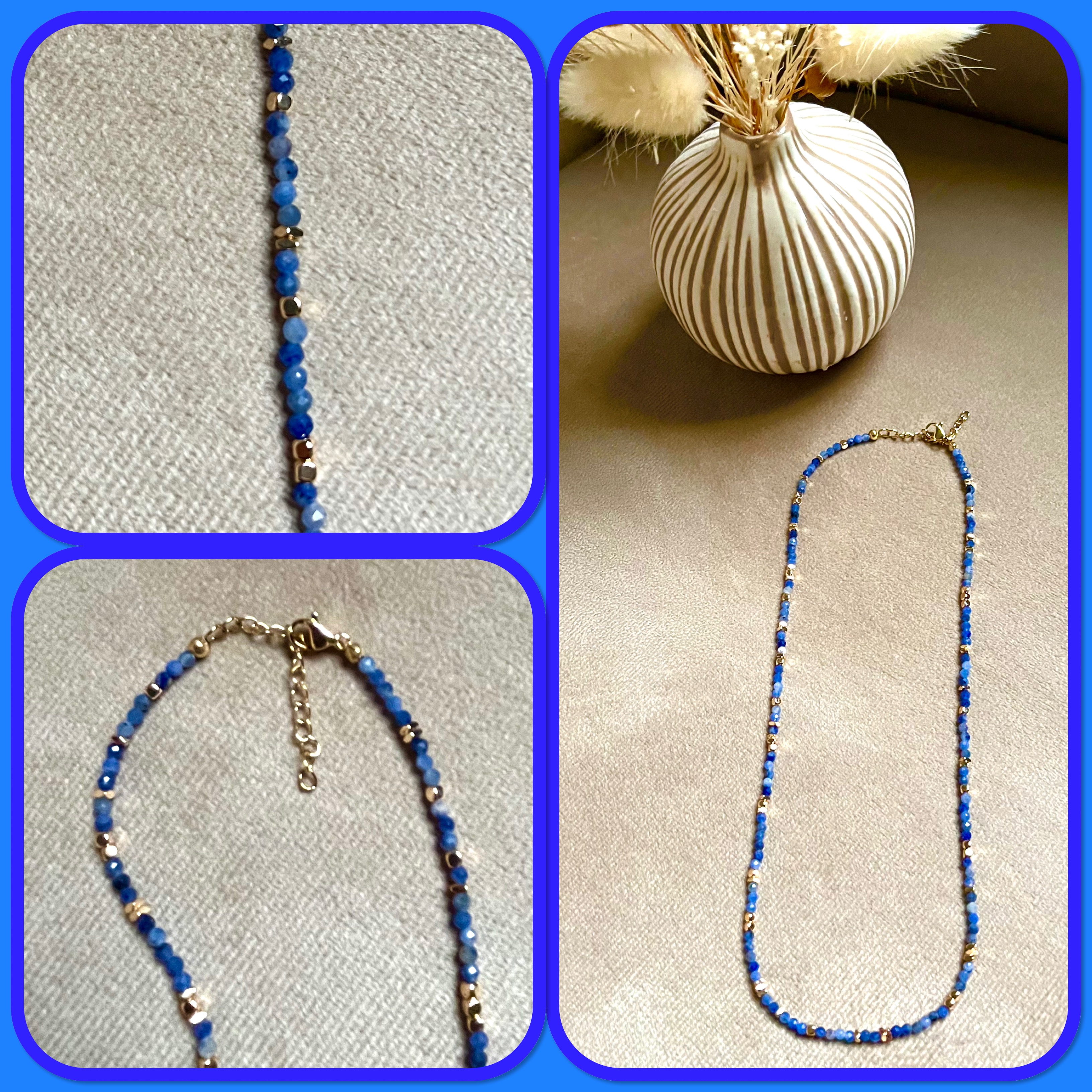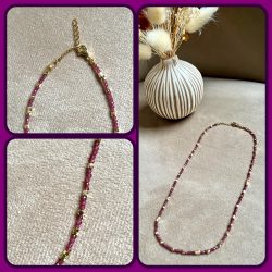 Collier en petites perles naturelles de différentes variétés : Amazonite, Turquoise africaine, Grenat, Sodalite, Quartz rose…